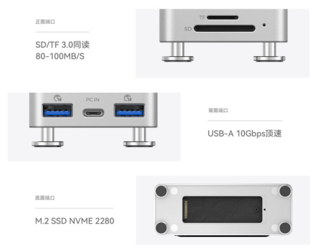 純機箱版可實現(xiàn)將設(shè)備“立”起來,節(jié)省桌面空間、加速設(shè)備散熱的基礎(chǔ)功能。DIY擴容版新增4個全能接口:2個USB-A口(10Gbps),2個支持3.0同讀的TF卡+SD卡讀卡口。底部額外增加一個M.2硬盤插槽,最高可DIY擴容8TB。