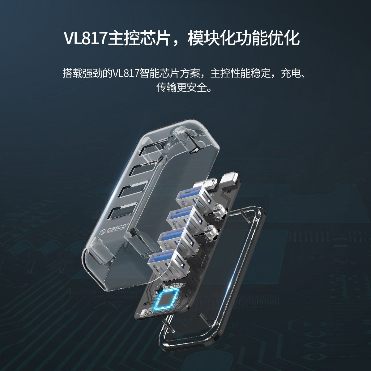 4口USB3.0透明桌面集線器,雙接口供電