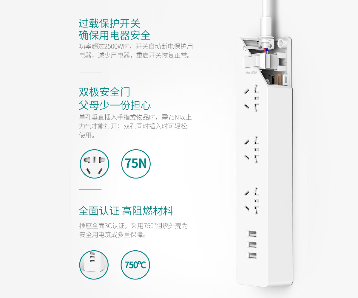 3A3U新國標(biāo)排插 雙極安全門 750℃耐高溫