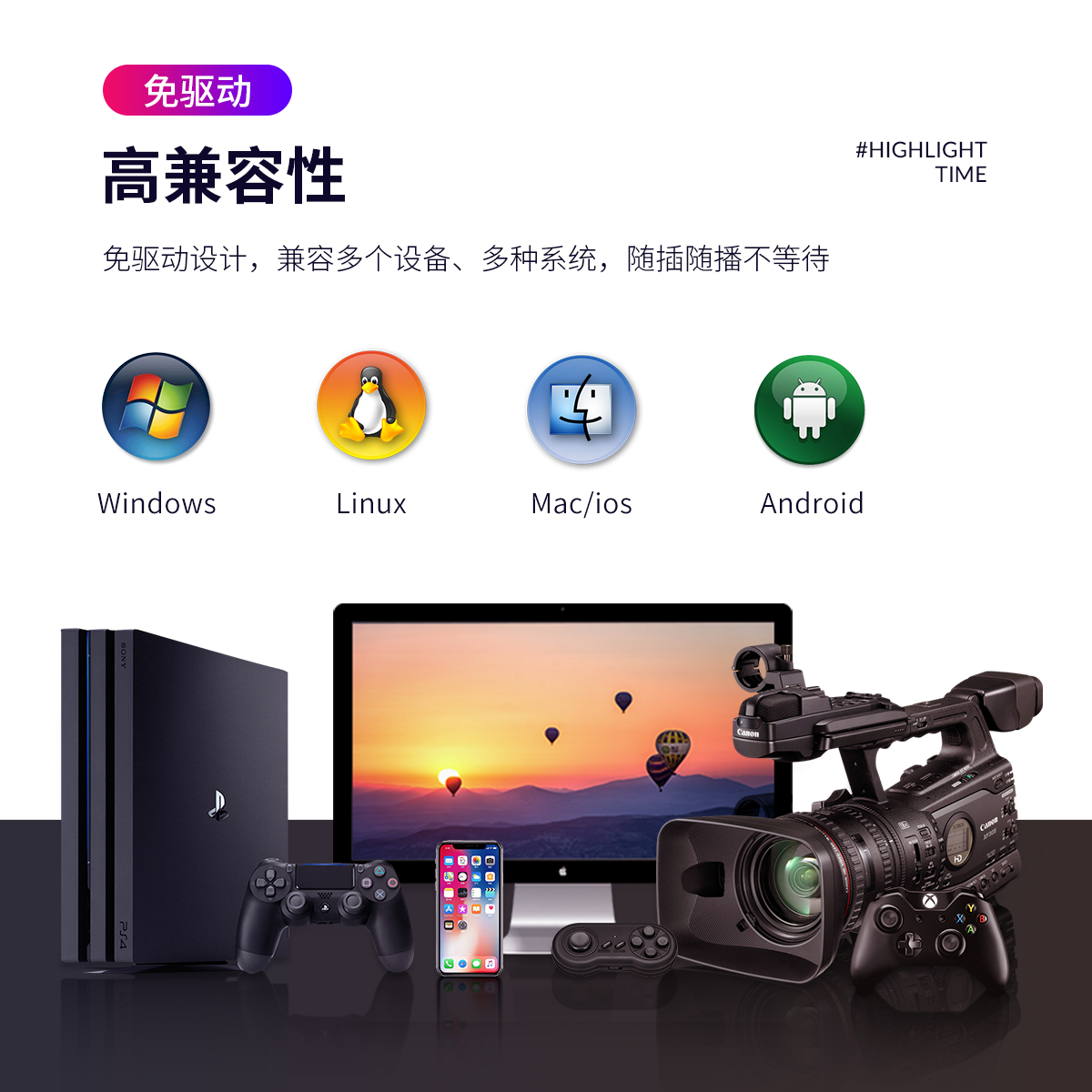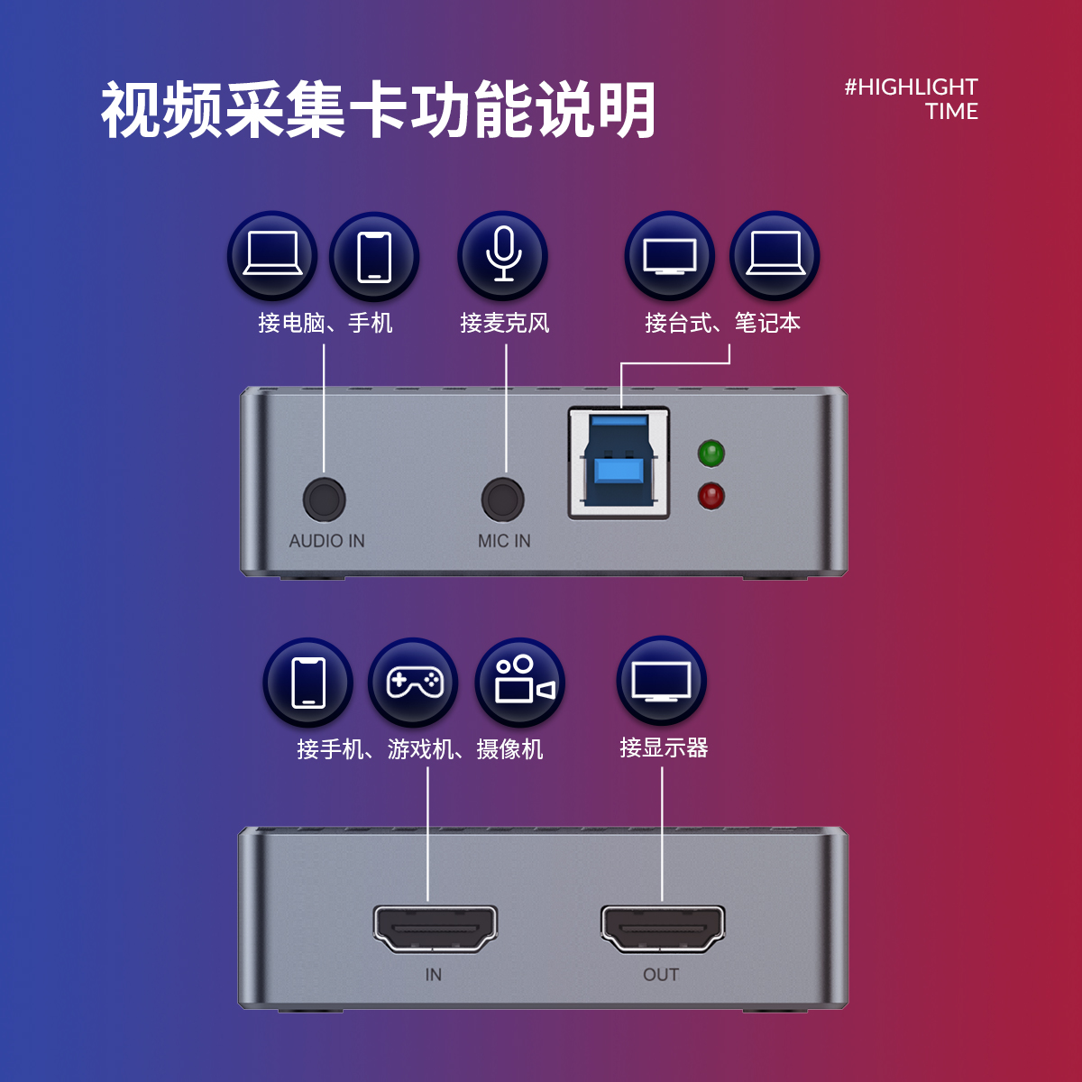 HDMI轉USB3.0采集卡,支持1080P@60Hz全高清輸入、環(huán)出、錄制,支持麥克風輸入和背景音樂輸入, 外殼主體由品質鋁合金打造,免驅動設計,兼容多個設備、多種系統(tǒng),