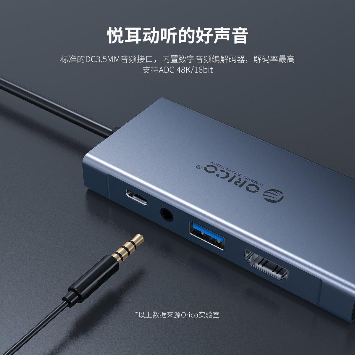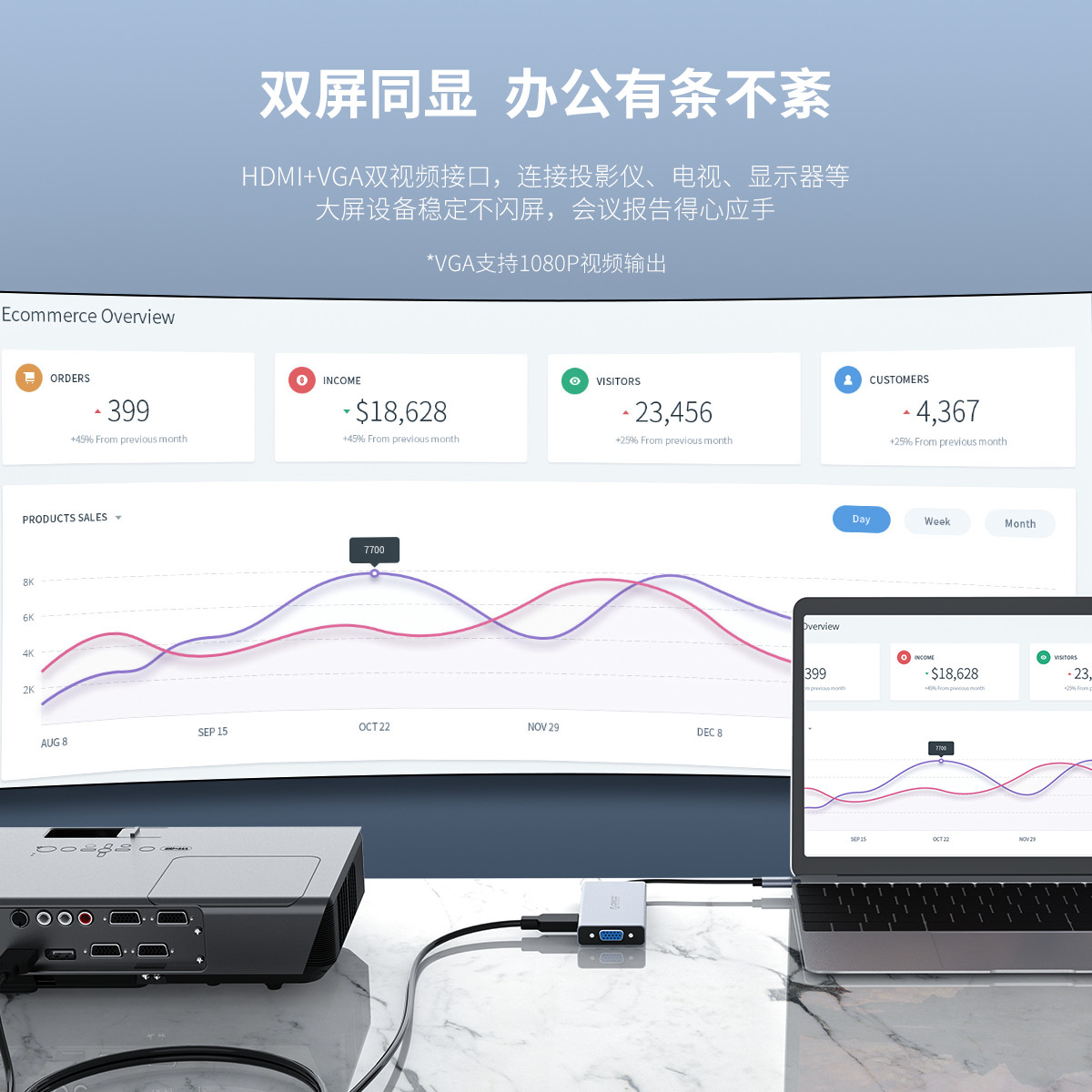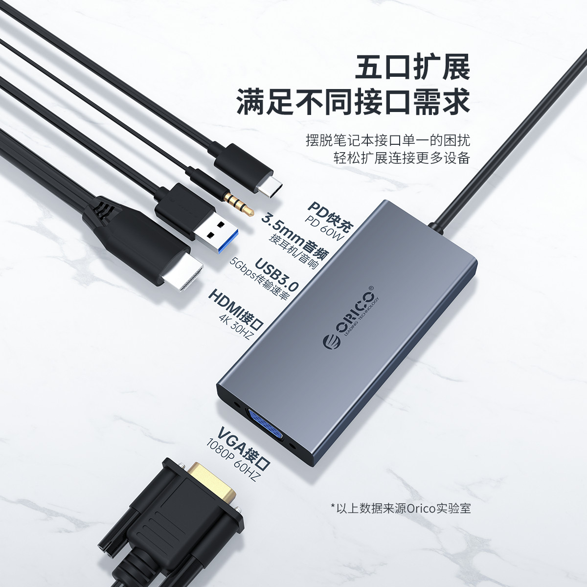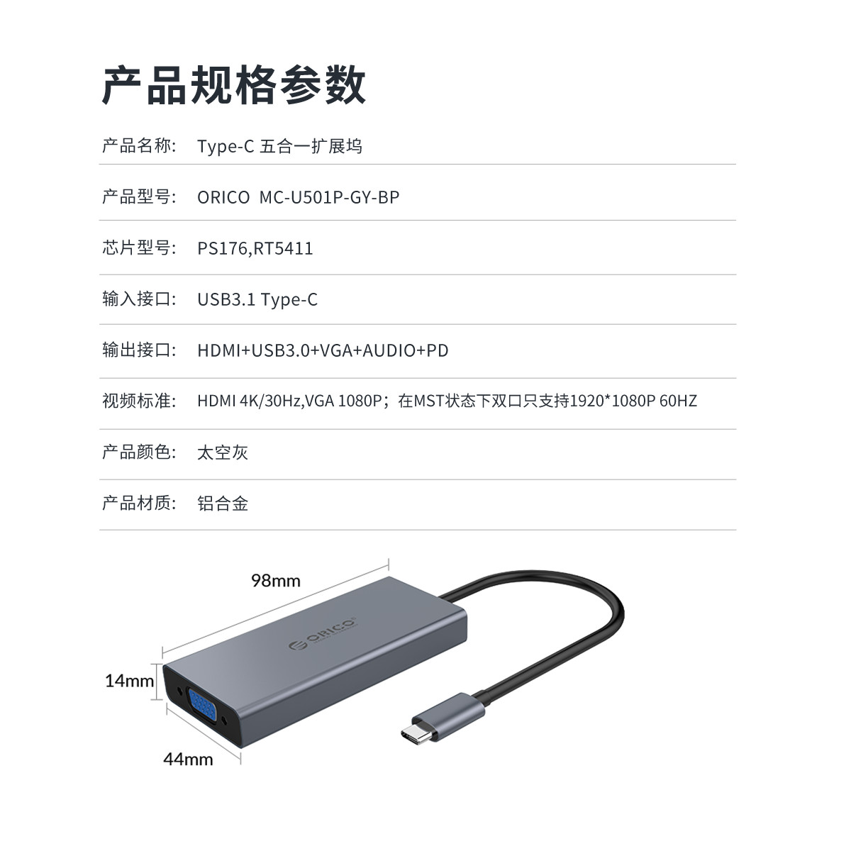 五口擴展,USB Type-C口支持PD2.0,HDMI支持4K 30HZ視頻傳輸,HDMI+VGA雙視頻接口,標準的DC3.5MM音頻接口,內(nèi)置數(shù)字音頻編解碼器