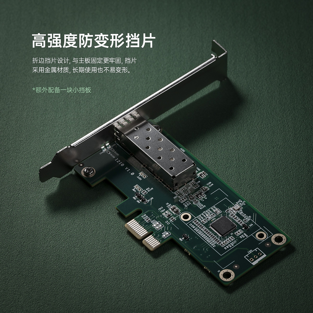 PCl-E插槽│強勁散熱|高速穩定,配備一個標準的SFP光纖口,可插入千兆光纖模塊,采用Intel 1210芯片,更大程度上消除干擾