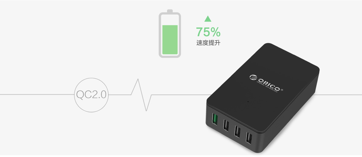綠色膠芯接口植入Qc2.0技術,可以改變電流電壓輸出,增大功率,以達到更快速的充電狀態,理論充電速度大大提升75%,經測試數據顯示,采用QC2.0充電,3300mAh電池,僅30分鐘可充60%電量。