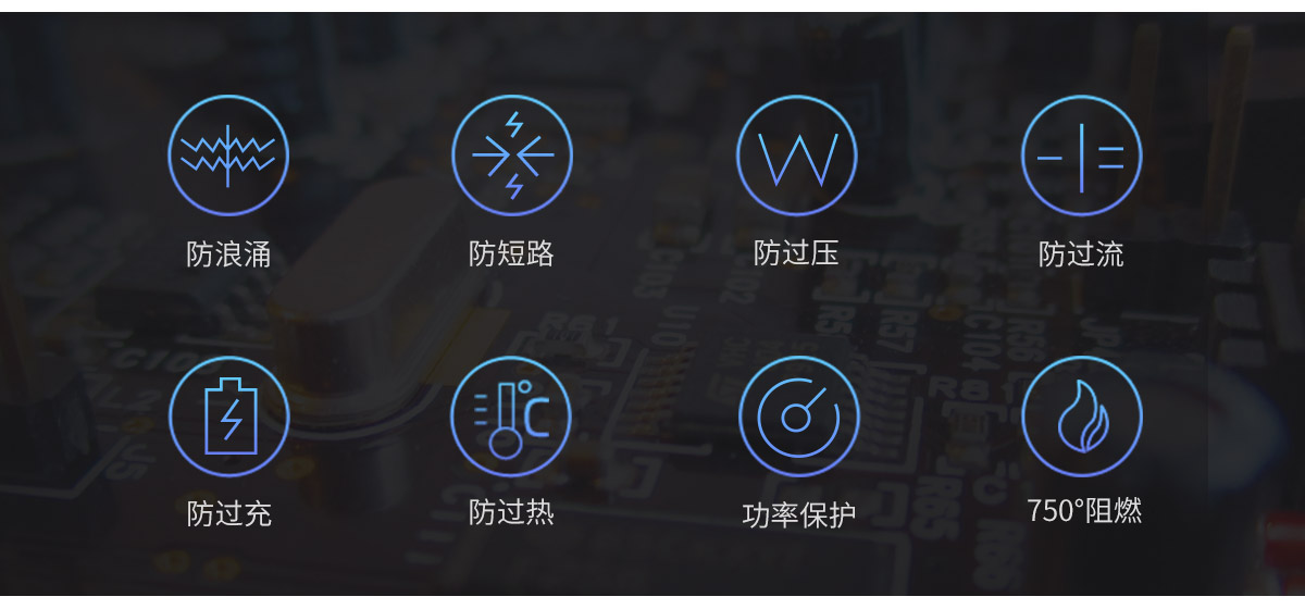 防過流 防浪涌 防過壓 防短路 防過充 防過熱 過功率保護(hù) 750。阻燃