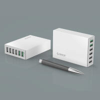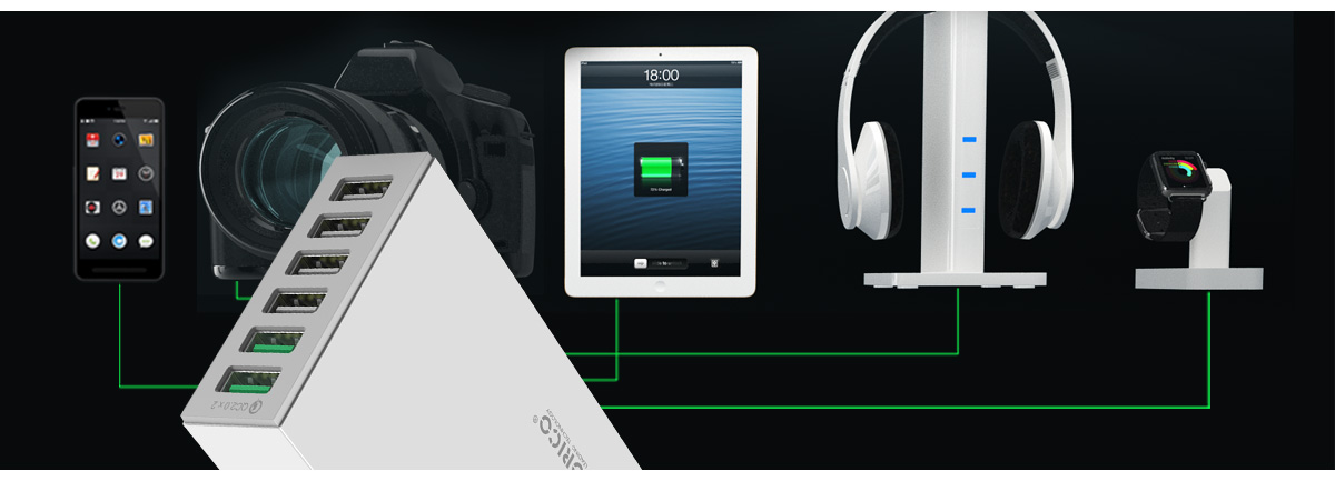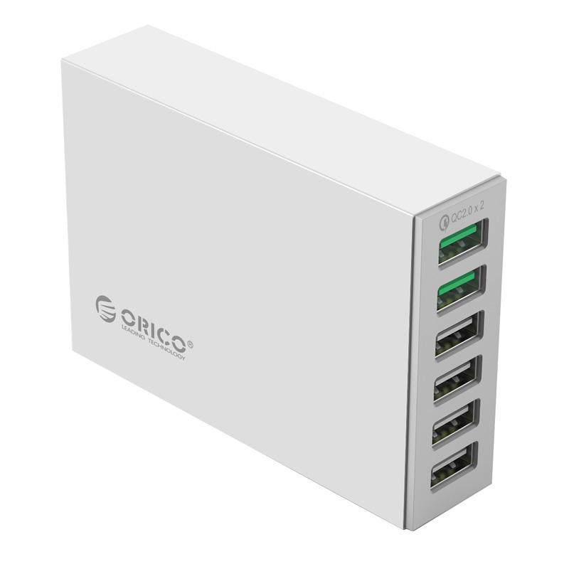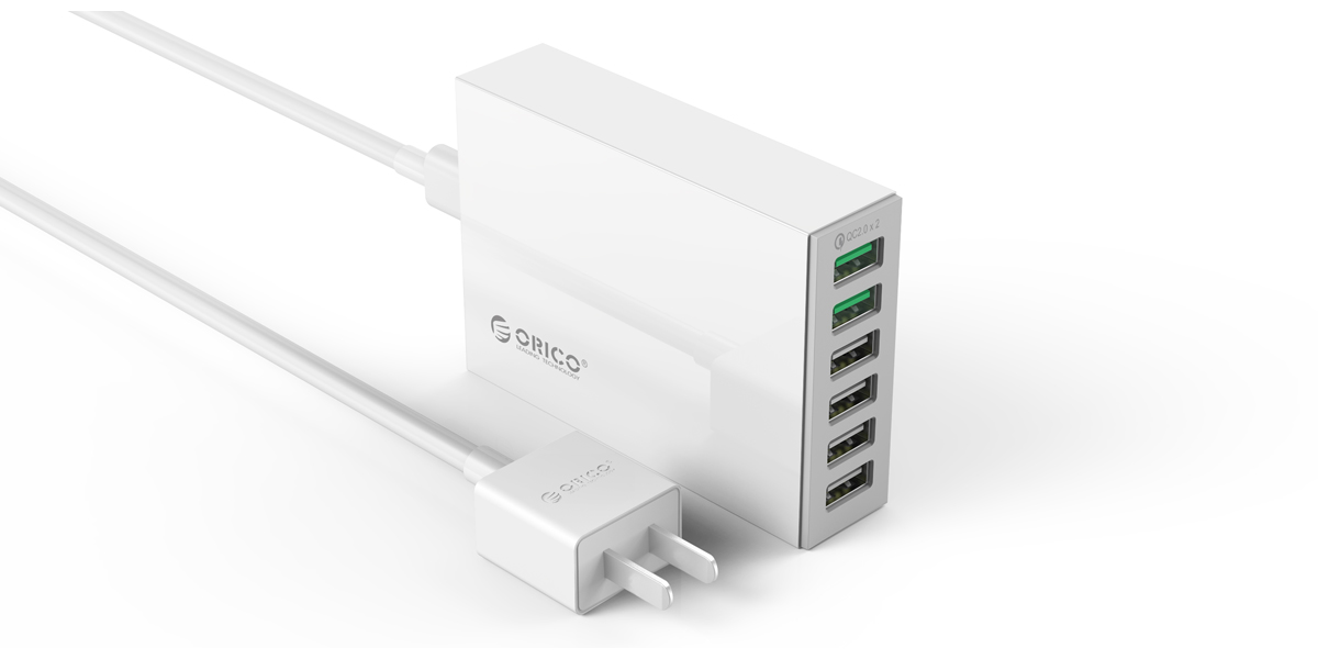 支持6臺設(shè)備同時(shí)充電,解決多人多設(shè)備充電問題,其中2個端口支持QC2.0(5V2.4A,9V2A,12V1.5A)輸出,4個端口支持5V2.4A大電流輸出,輸出總功率為50W,一臺設(shè)備幫您打造您的桌面充電站。