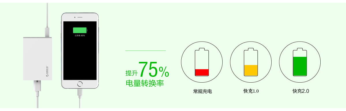 應(yīng)急時(shí)刻,僅僅充電十分鐘,即可為您提供20%的續(xù)航,相比傳統(tǒng)充電器,充電速度提高了75%,30分鐘即可充至60%-75%的電量(以3000mAh的手機(jī)為例),QC2.0快速充電器大幅度減少您的充電等待時(shí)間。