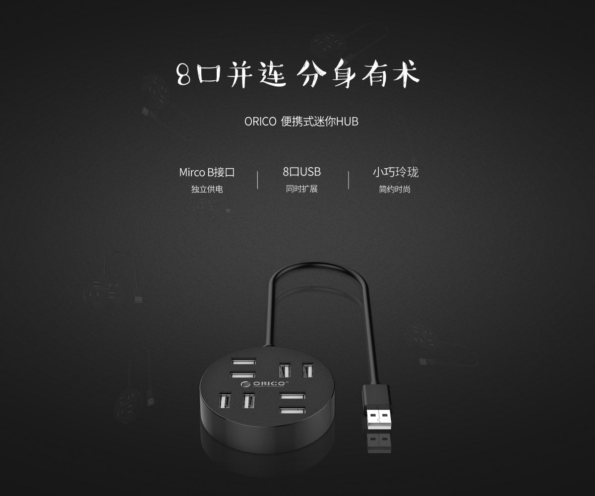 8口USB2.0便捷式圓形集線器,micro B接口供電