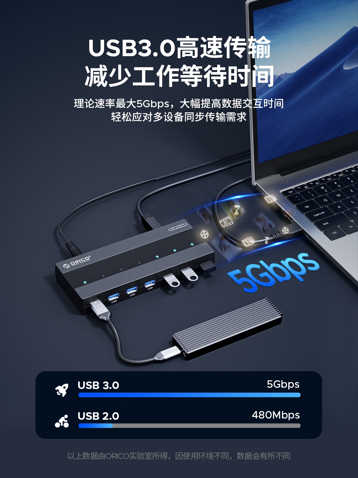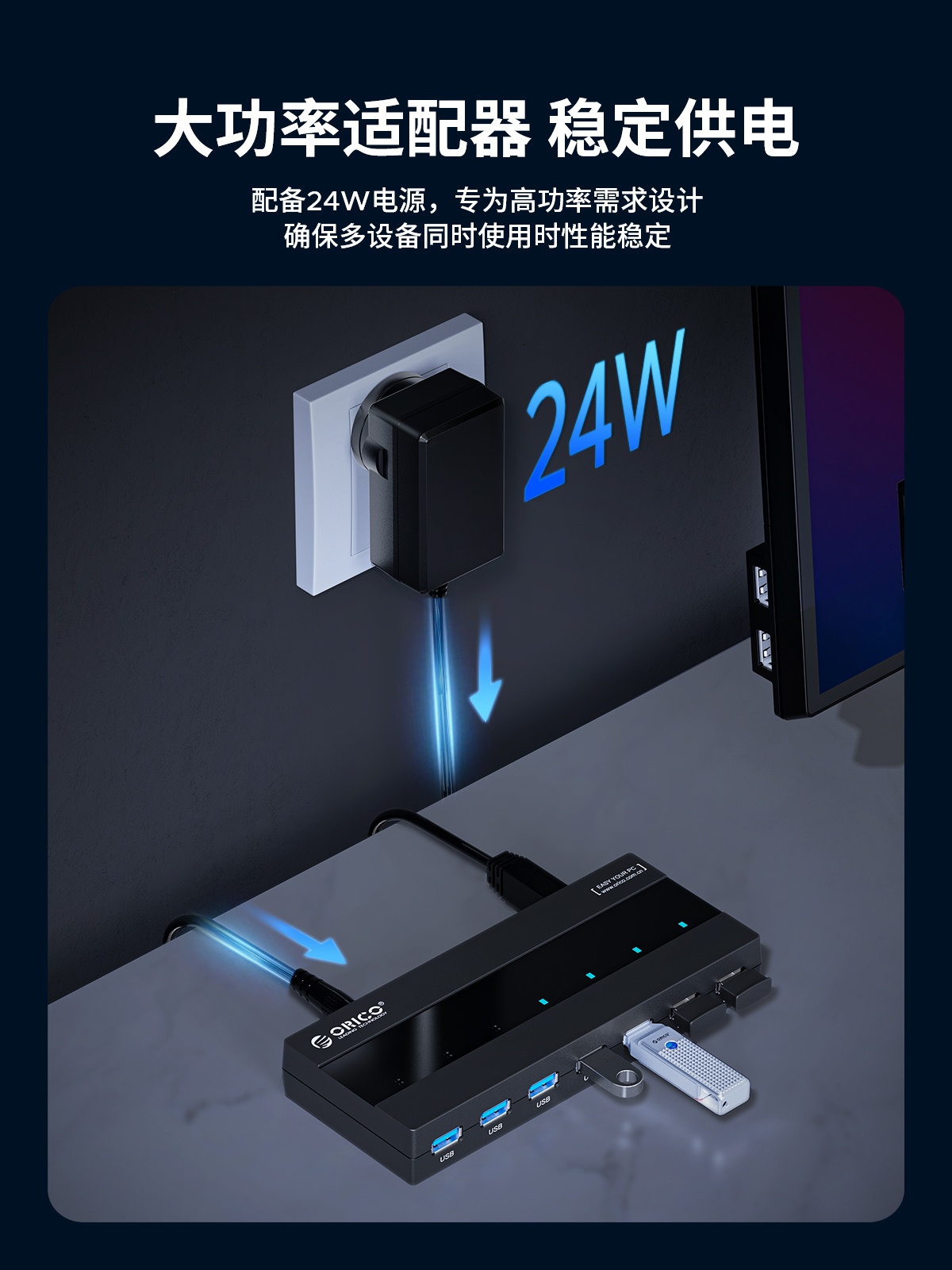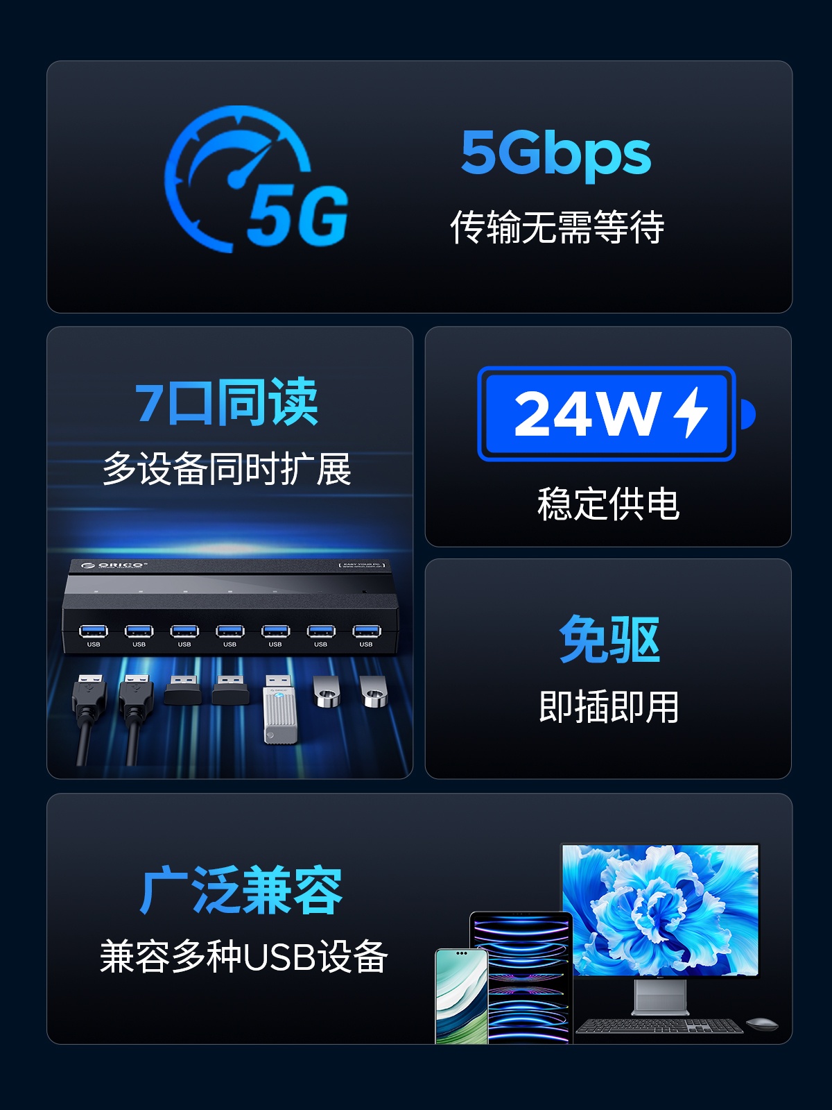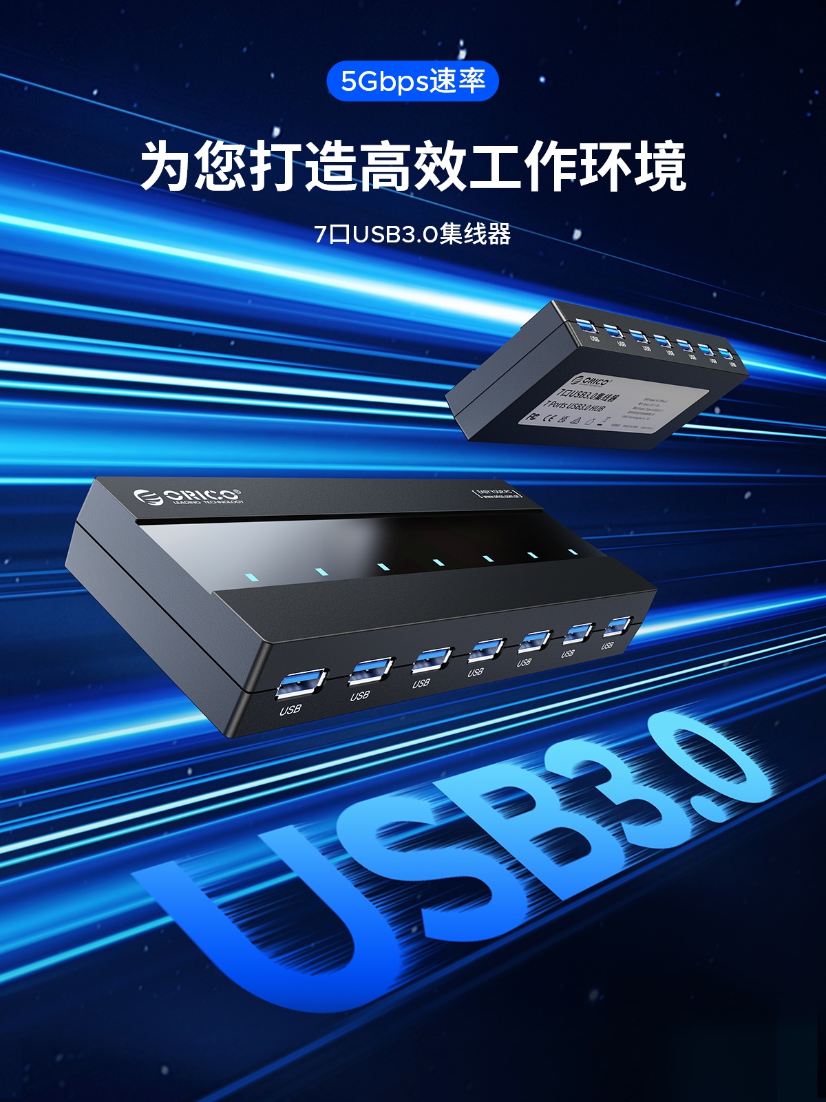 7口USB3.0桌面集線器,60W獨(dú)立供電