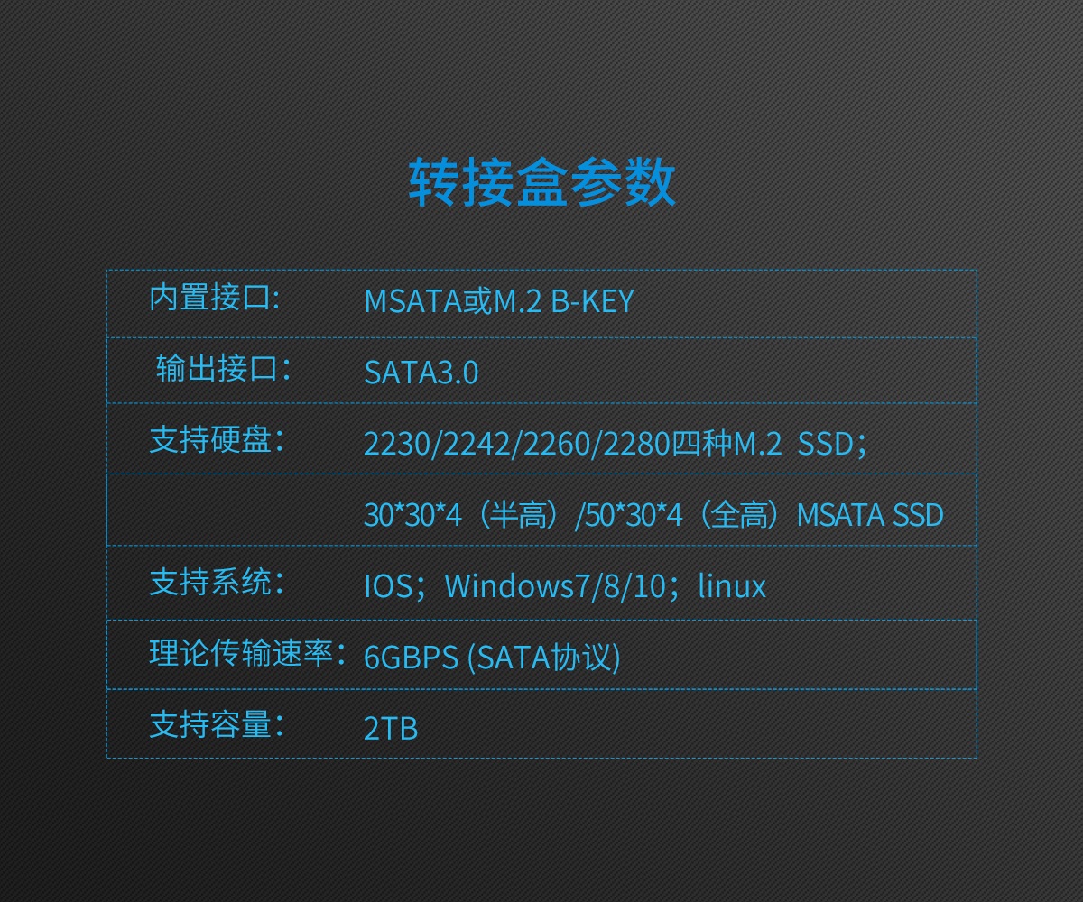 鋁合金材質,支持2230/2242/2260/2280四種M.2 SSD,6Gbps頂速傳輸,2TB大容量支持。