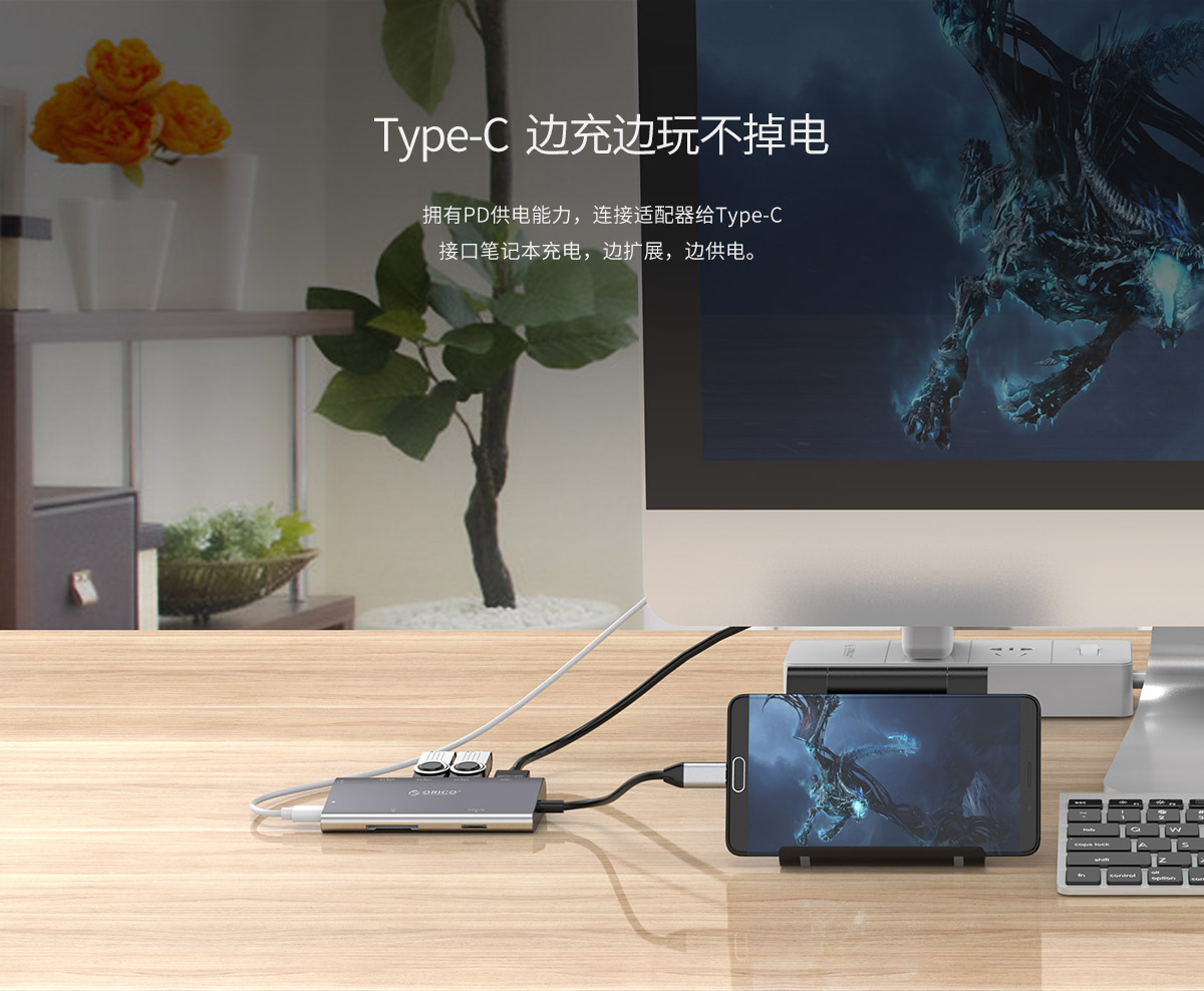 TYPE-C接口接適配器給主機充電支持USB PD:5-20V,3A,60W max; 音視頻支持同步播放 ,HDMI 最大分辨率可支持4K@30Hz RJ45網卡口自適應10/100/1000Mbps