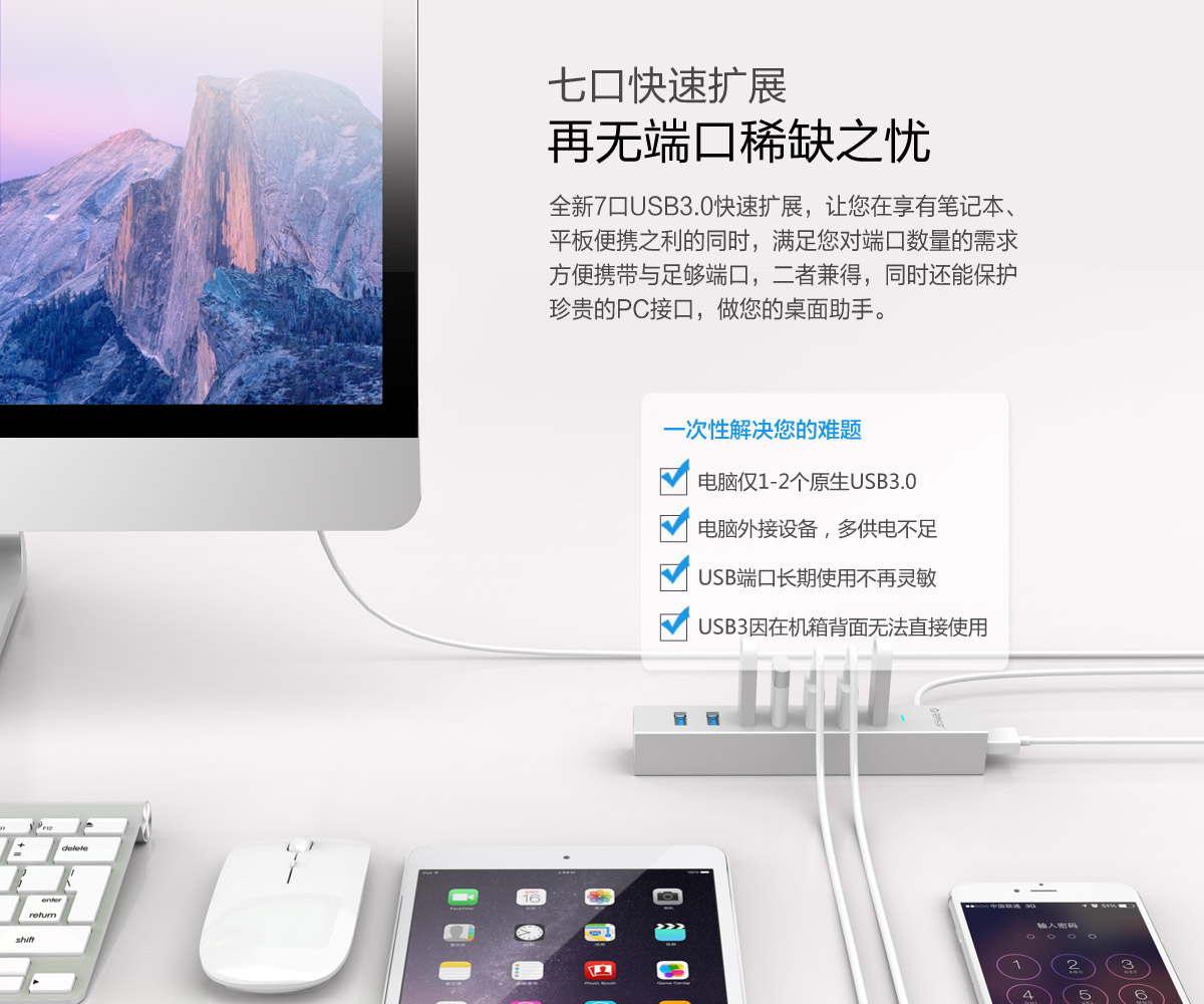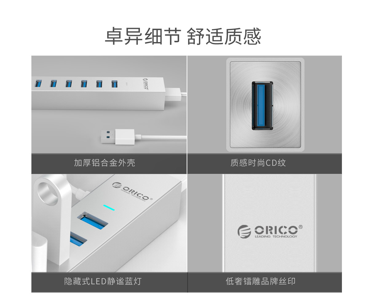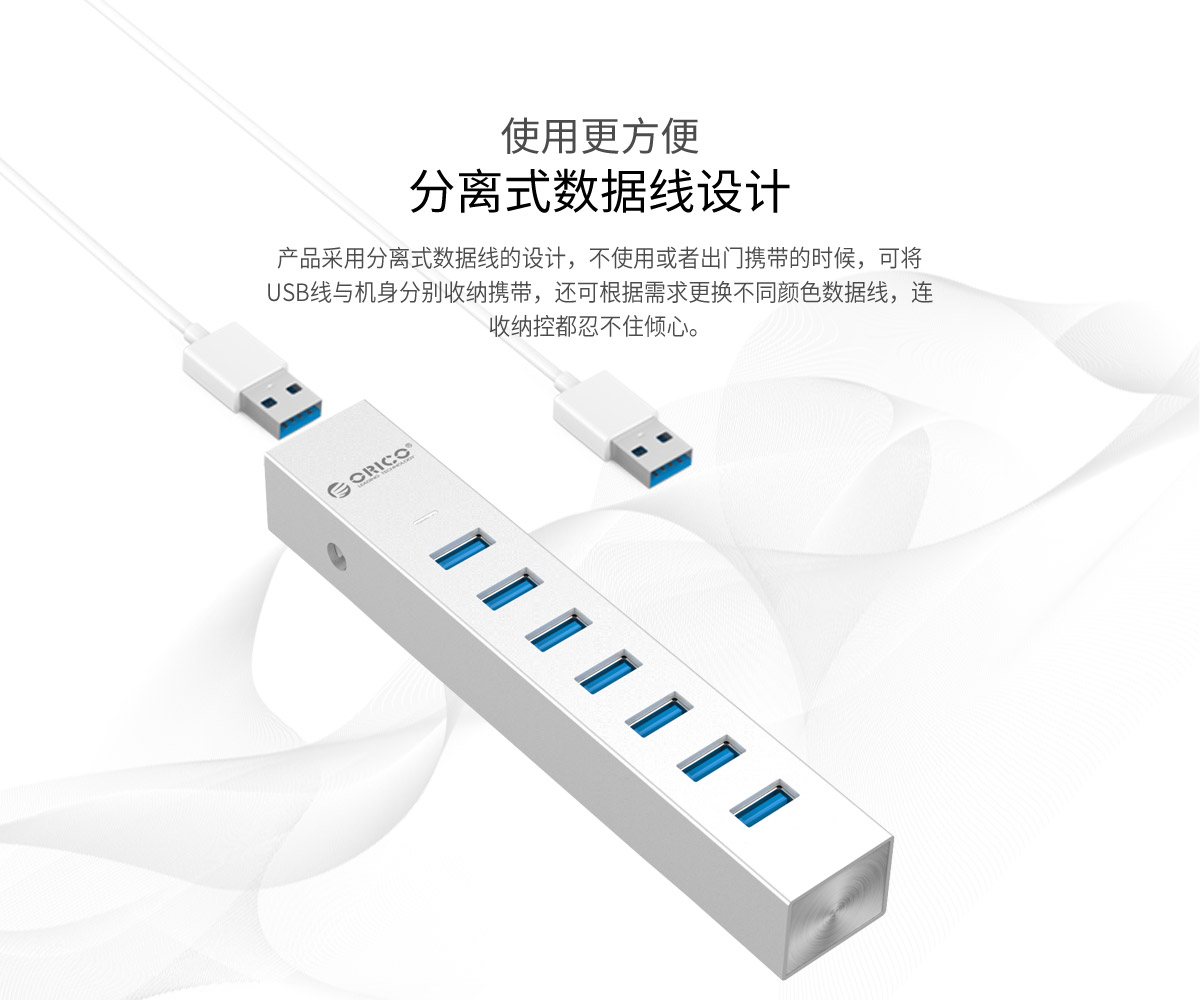 7口鋁合金USB3.0分線器,分離式數(shù)據(jù)線