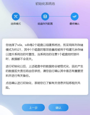 安裝完更新后進入到初始化系統池設置,點擊初始化設備(默認選擇 簡單模式 ),點擊“下一步”。