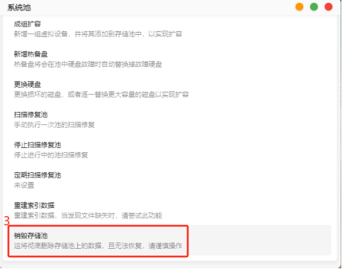 往下滑動(dòng)找到“銷毀存儲(chǔ)池”,點(diǎn)擊后輸入管理員密碼,即可完成存儲(chǔ)池的銷毀。