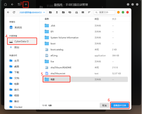 點擊左上角的“+”,再選擇外部存儲設備的影視文件夾后,點擊“選取選中文件”。