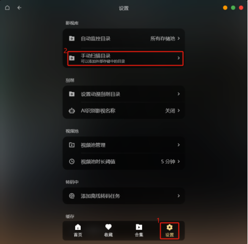 點擊影視應用的底下的“設置”,再點擊“手動掃描目錄”進到手動掃描目錄管理。