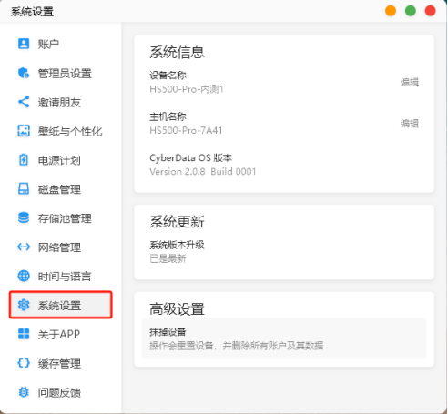 在系統(tǒng)設(shè)置界面可以修改設(shè)備名稱和主機名稱,也可以查看到目前的系統(tǒng)版本,并對設(shè)備進行升級。在高級設(shè)置里還可以對設(shè)備進行抹掉處理。