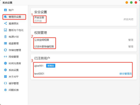 (1)目前默認第一位注冊的用戶為管理員,管理員可以在“系統(tǒng)設(shè)置”對設(shè)備進行管理。 (2)“安全設(shè)置”中的開放注冊默認為開啟狀態(tài),如需暫停用戶注冊,可點擊關(guān)閉。 (3)“權(quán)限管理”中的公共空間權(quán)限和 USB 外部存儲權(quán)限可選擇對部分用戶進行限制訪問。 (4)“已注冊用戶”目前可以查看到設(shè)備注冊人數(shù),還可以進行移交管理員操作。