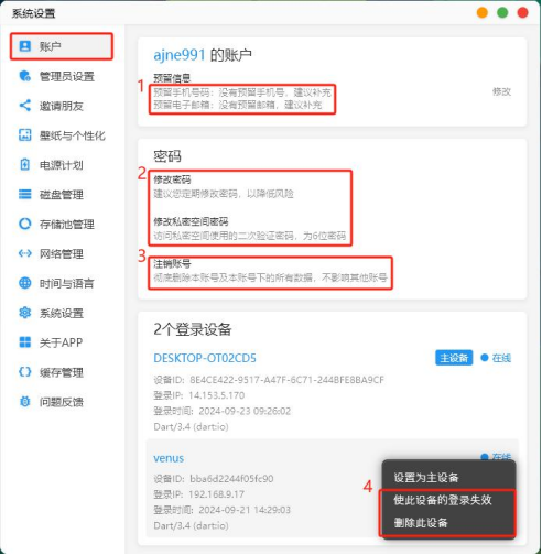 (1)可以增加賬號的預留手機號碼和電子郵箱,如果忘記賬號密碼可以通過預留信息來修改密碼。 (2)可以通過定期修改密碼來增加設(shè)備的安全性。 (3)如果賬號不使用了可以對賬號進行注銷。 (4)當 NAS 在多個設(shè)備上進行登錄時,可以對登錄的設(shè)備進行下線,或刪除該設(shè)備的登錄信息。