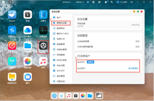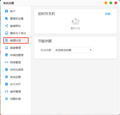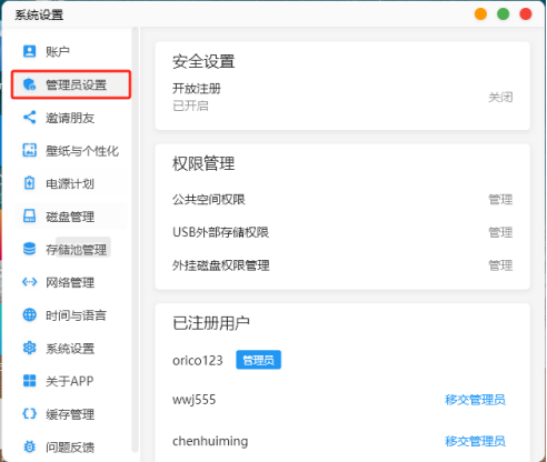 管理員賬號的“系統(tǒng)設(shè)置”界面比普通用戶多了四個頁面,分別為管理員設(shè)置、邀請朋友、電源計劃和系統(tǒng)設(shè)置。