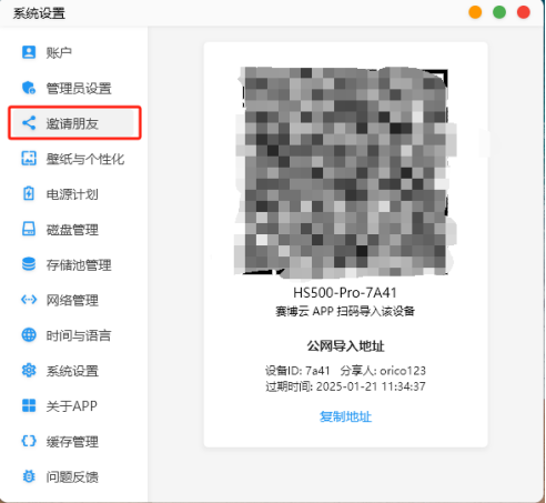 在邀請朋友界面,可以生成設(shè)備邀請二維碼和公網(wǎng)導入地址,以便分享設(shè)備給其他人使用。