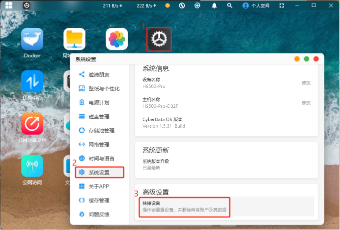 (1)點(diǎn)擊首頁(yè)的“設(shè)置”,選擇“系統(tǒng)設(shè)置”,進(jìn)到系統(tǒng)信息界面。在“高級(jí)設(shè)置”目錄下點(diǎn)擊“抹掉設(shè)備”。